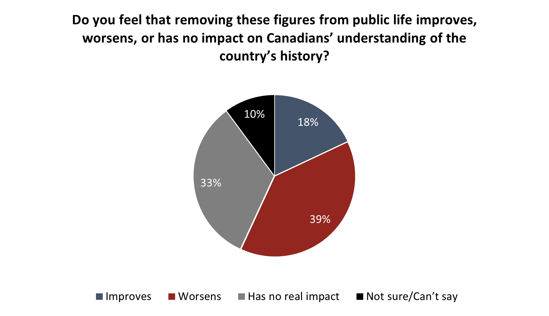 Two-in-five (39%) Canadians believe removing these figures from prominence in public life “worsens” Canadians’ understanding of history, while one-in-five (18%) argue it instead “improves” it. One-third (33%) say changing the names of public institutions and buildings and removing statues doesn’t effect Canadians’ understanding of history at all: