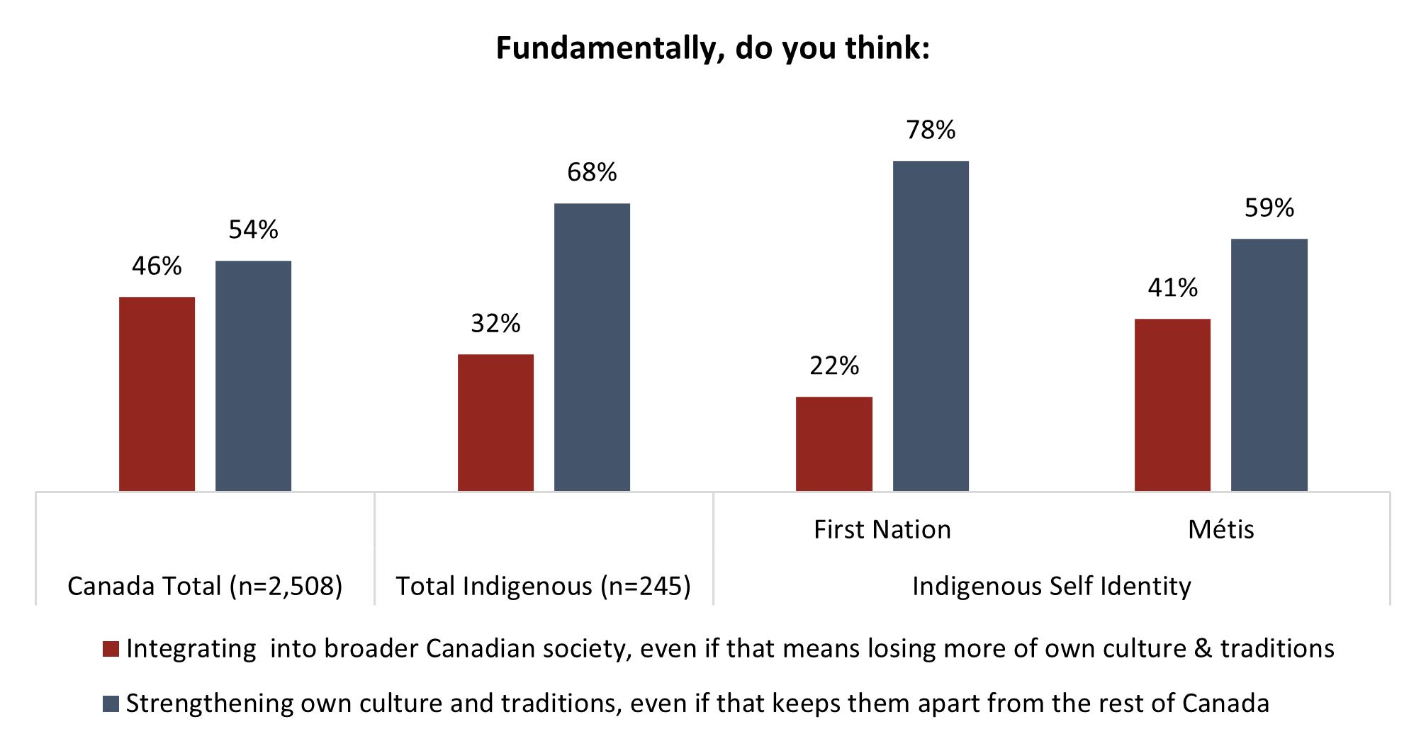 Among the most pronounced splits in these data are the views of those who identify as Indigenous in Canada. These individuals are far more likely to feel that strengthening one’s own culture and traditions is more important than integrating into “broader Canadian society” which may mean abandoning some of those ideas and practices. Those who identify as First Nation are most likely to support this cultural strengthening, as well as moving toward more independence and control, and recognizing special status for Indigenous Peoples (see detailed tables). Among the general population, views are divided close to evenly.