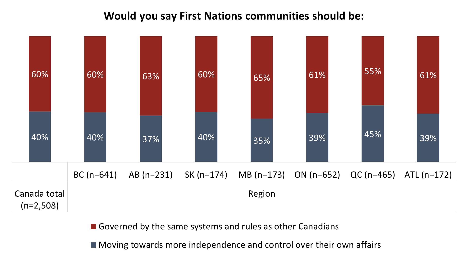 Across the country – as will be seen in subsequent sections of this report – western Canadians tend to be more critical of the funding and attention given to Indigenous Peoples. On the issue of governance, however, these views align with Ontario and Atlantic Canada. Only in Quebec do fewer than three-in-five Canadians say that Indigenous groups should be governed by the same systems and rules as others. For detailed regional results, click here.