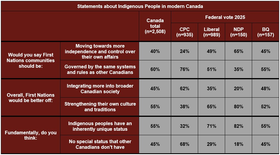Another factor that drives discord on views of Indigenous status and rights is political perspective. New Democratic Party voters, though far fewer in number now than before April 2025, are most aligned with the predominant Indigenous perspective, whereas Conservatives push back to the highest degree. Liberal Party voters tend to walk a line between these two groups, though it is worth noting that seven-in-10 (71%) say Indigenous People have an inherently unique status: