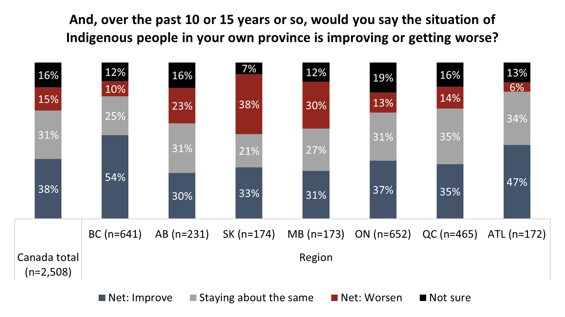 The perception in Canada is generally one of improvement for Indigenous Peoples lives, at least the largest group (38%) feel this way. This is more than twice as many who perceive a worsening in their home province (15%):