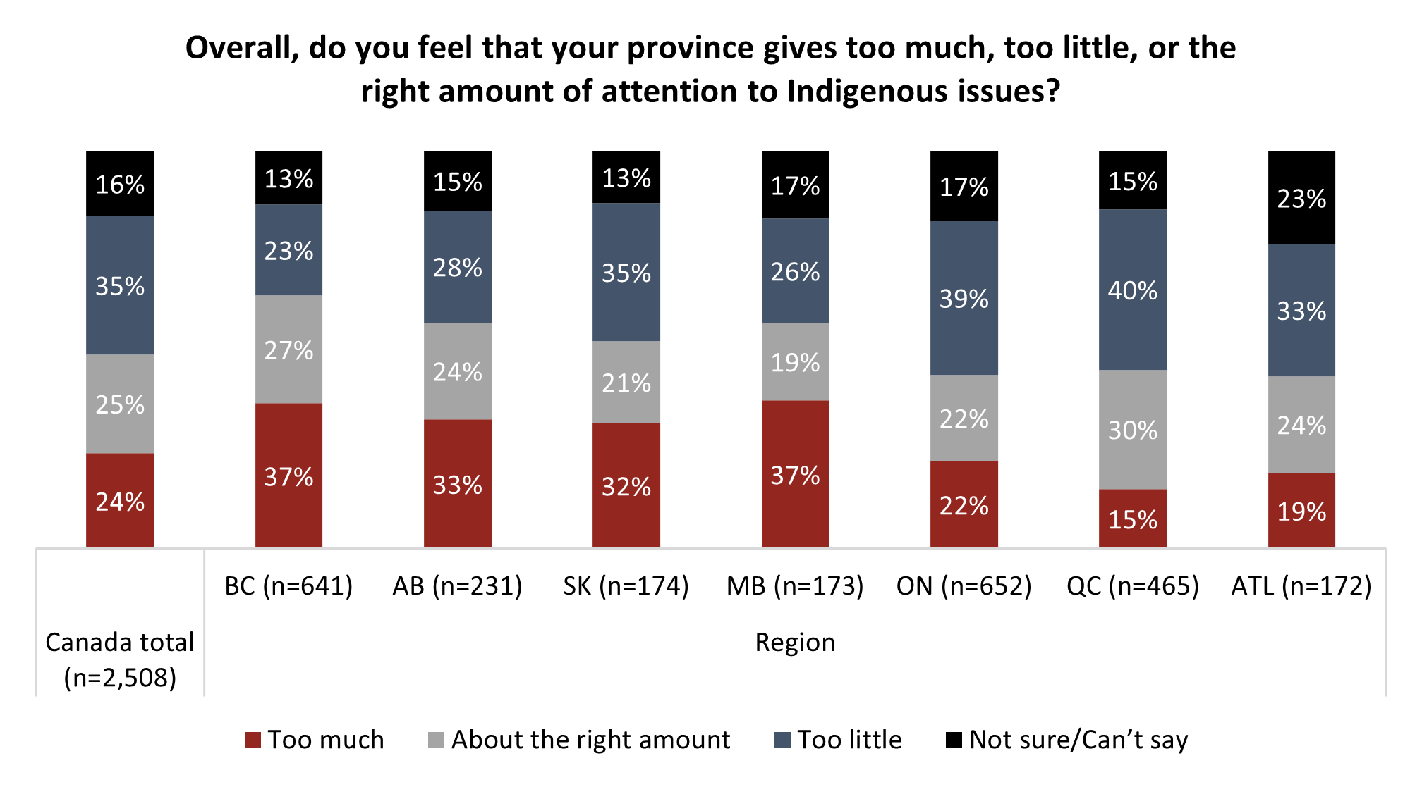 The issue of attention paid to Indigenous issues is one that is discussed at the provincial level as well. Canadians living in the west of the country appear to have a much different perception of attention paid to Indigenous issues than those living in the east. Two-in-five in Ontario and Quebec believe their provincial governments give “too little” attention to Indigenous issues, while B.C. and Manitoba have the highest proportion of people who believe their governments give “too much”.