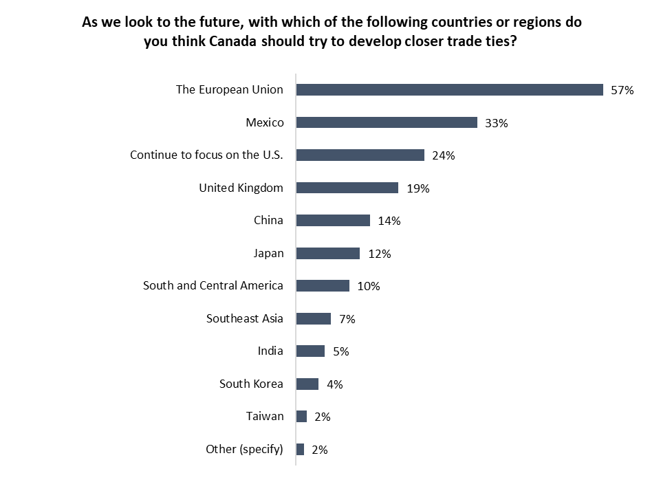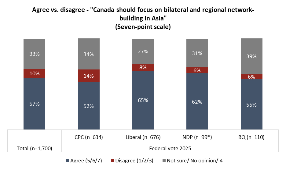 - Three-in-five (57%) believe “Canada should focus on bilateral and regional network-building in Asia”.