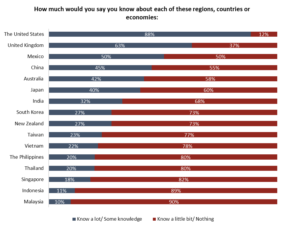 In fact, of the ASEAN member countries included in this survey, Canadians are most knowledgeable of Vietnam (22%), the Philippines (20%) and Thailand (20%). As a region, knowledge of Southeast Asia among Canadians is much lower than China (45%), Australia (42%) and Japan (40%):