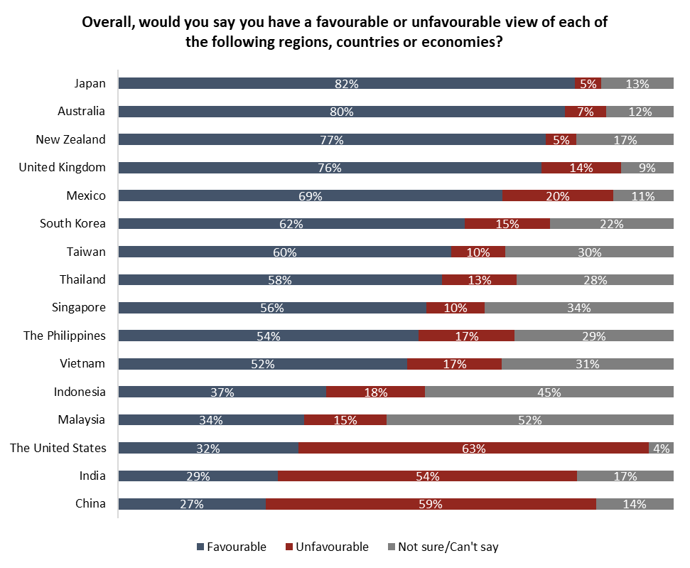 - A high percentage of Canadians have favourable views of Japan (82%), Australia (80%), and New Zealand (77%). Favourability is lower, but still at a majority level for South Korea (62%), Taiwan (60%) and the Philippines (54%).