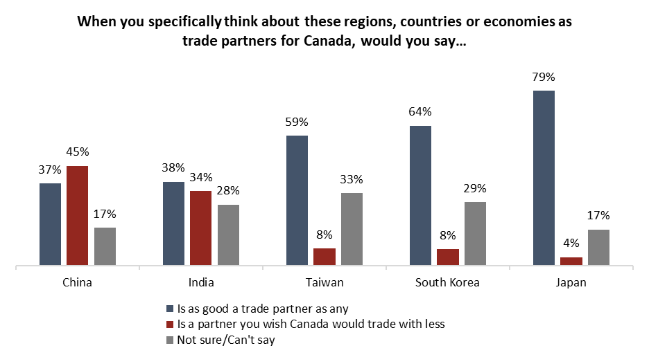 - Most say they view Japan (79%), South Korea (64%) and Taiwan (59%) as “as good a trade partner as any” rather than one Canada should do less business with.