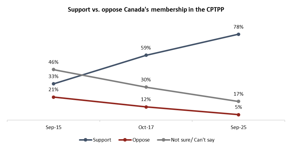 Still, support for Canada’s membership in the CPTPP has grown over time. In 2017, prior to the agreement being signed, three-in-five (59%) Canadians said they supported Canada’s potential membership in the trade deal. Eight years later, and seven years after its ratification, support has climbed to nearly four-in-five (78%):