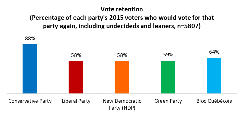 Conservative strength comes from the party’s higher retention rate. The party is holding the votes of nearly nine-in-ten who voted CPC in 2015, while fewer than six-in-ten 2015 Liberals say they’re inclined to vote for Trudeau’s party again today:
