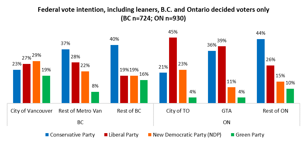 Today, the Liberals lead by a wide margin in the City of Toronto and are neck-and-neck with the NDP in the City of Vancouver, but they find themselves tied or trailing in in those cities’ suburbs, and trailing badly in the rest of B.C. and Ontario: