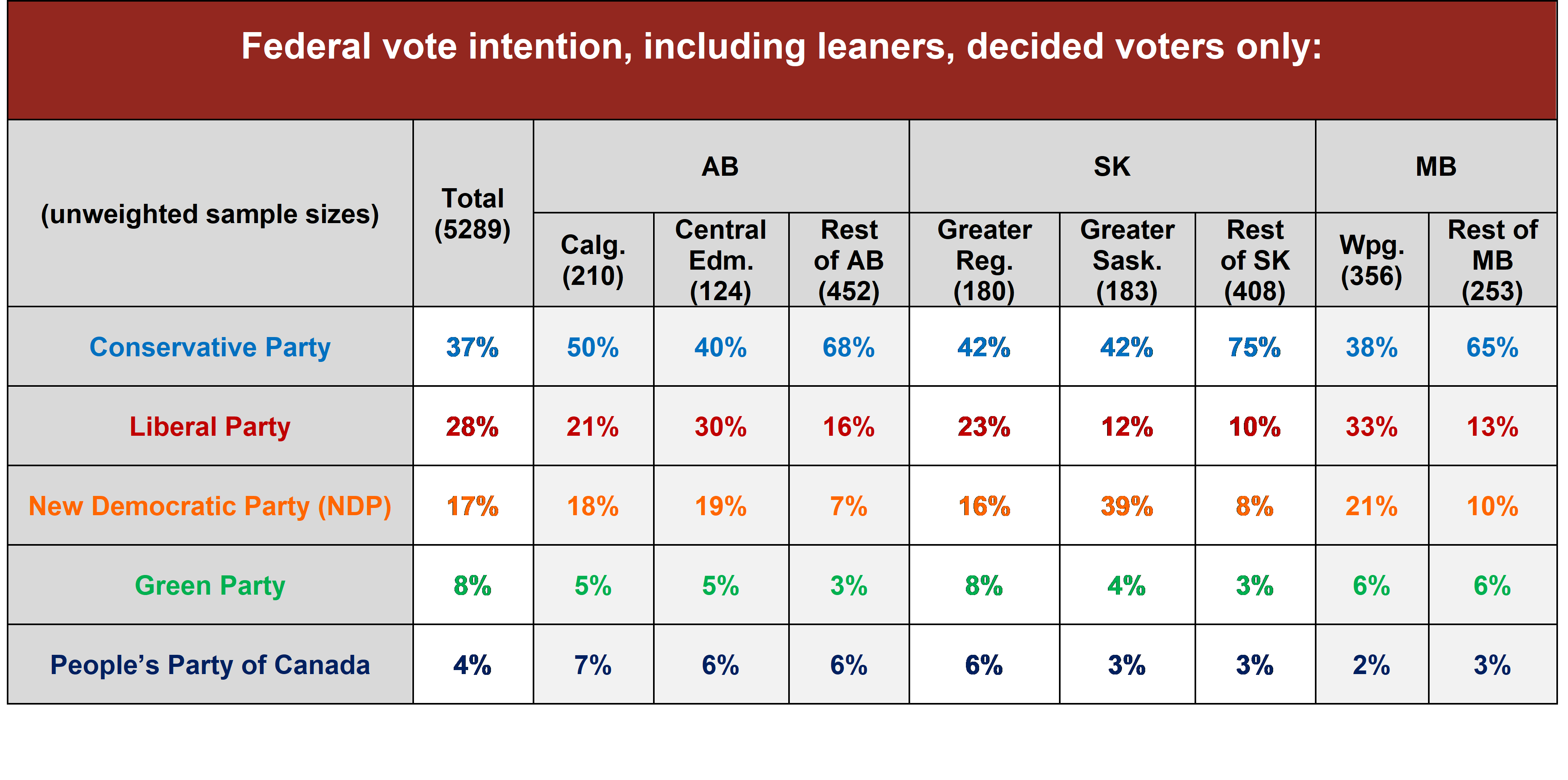 The CPC leads by wide margins in the prairie provinces of Alberta, Saskatchewan, and Manitoba, and by smaller, four-point margins in vote-rich Ontario and 2015 Liberal stronghold Atlantic Canada.