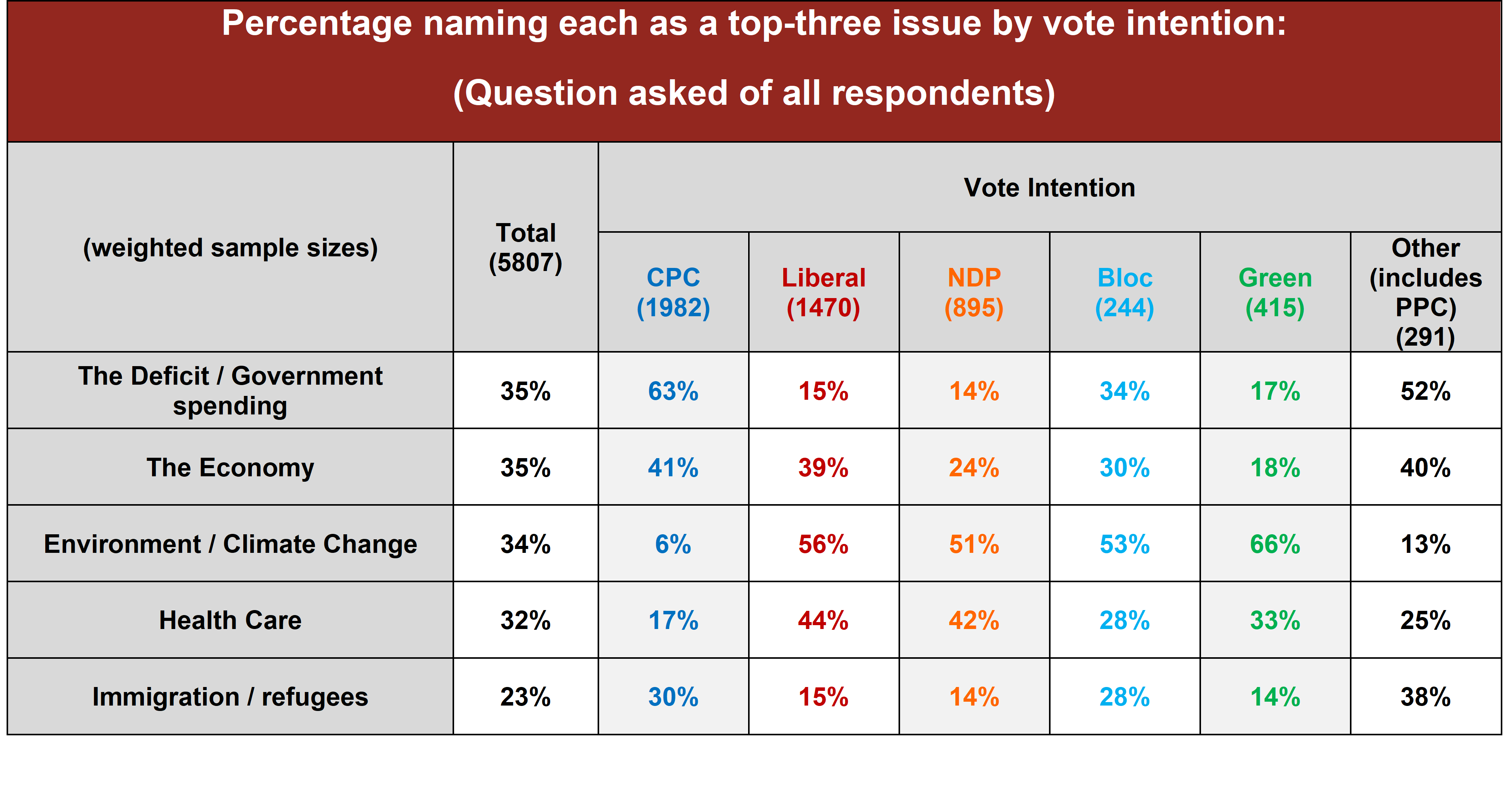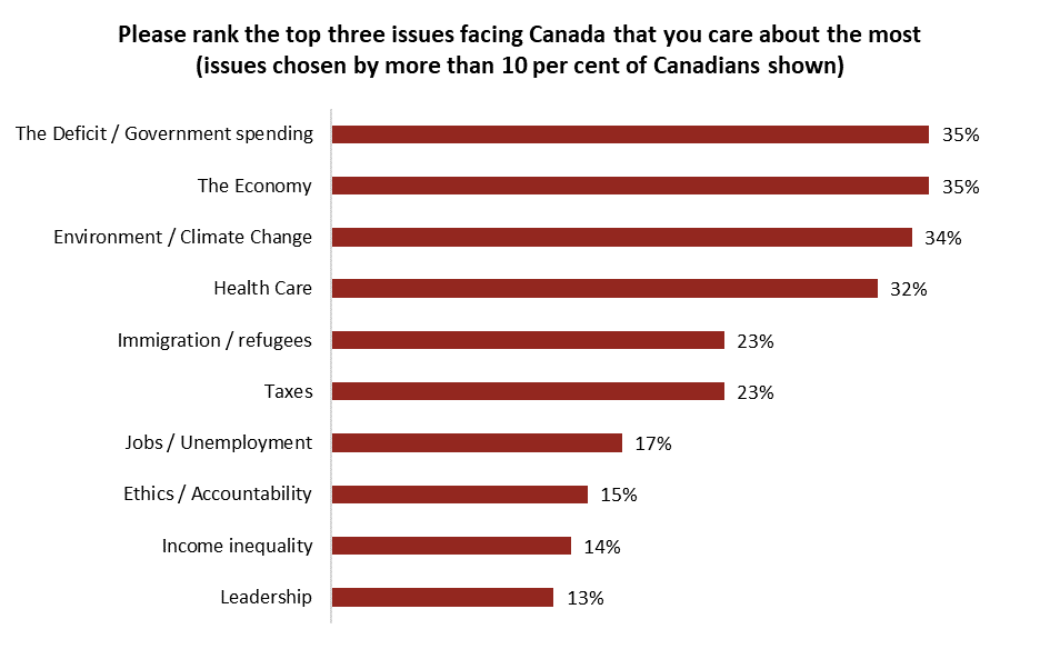 Asked to choose the top three issues in Canada today, Canadians name three topics – the deficit/government spending (35%), the economy (35%), and the environment/climate change (34%) – at a roughly equal rate. The balance between economic growth and environmental sustainability is something the government has been vocal about since 2015, and represents a difficult challenge for each leader to make their case on.