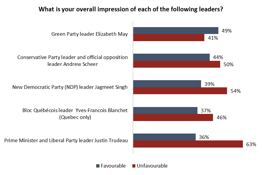 - More Canadians have a favourable view of CPC leader Andrew Scheer (44% do) and New Democratic Party leader Jagmeet Singh (39%) than Prime Minister Justin Trudeau (36%)