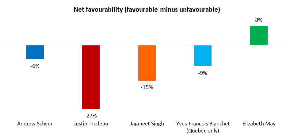 Looking at net favourability (unfavourable minus favourable) makes it clear that – although each of the three main leaders is more disliked than liked – Trudeau is easily the least popular: