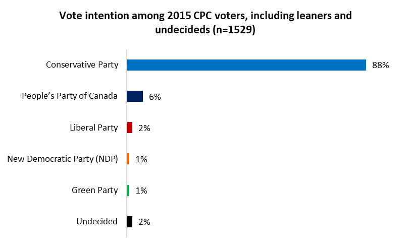 The CPC, by contrast, appears to be losing just a handful of supporters (6%) to former Conservative cabinet minister Maxime Bernier and his People’s Party of Canada. Aside from that challenge, few 2015 Conservatives are jumping ship – with 88 per cent saying they intend to support the party again: