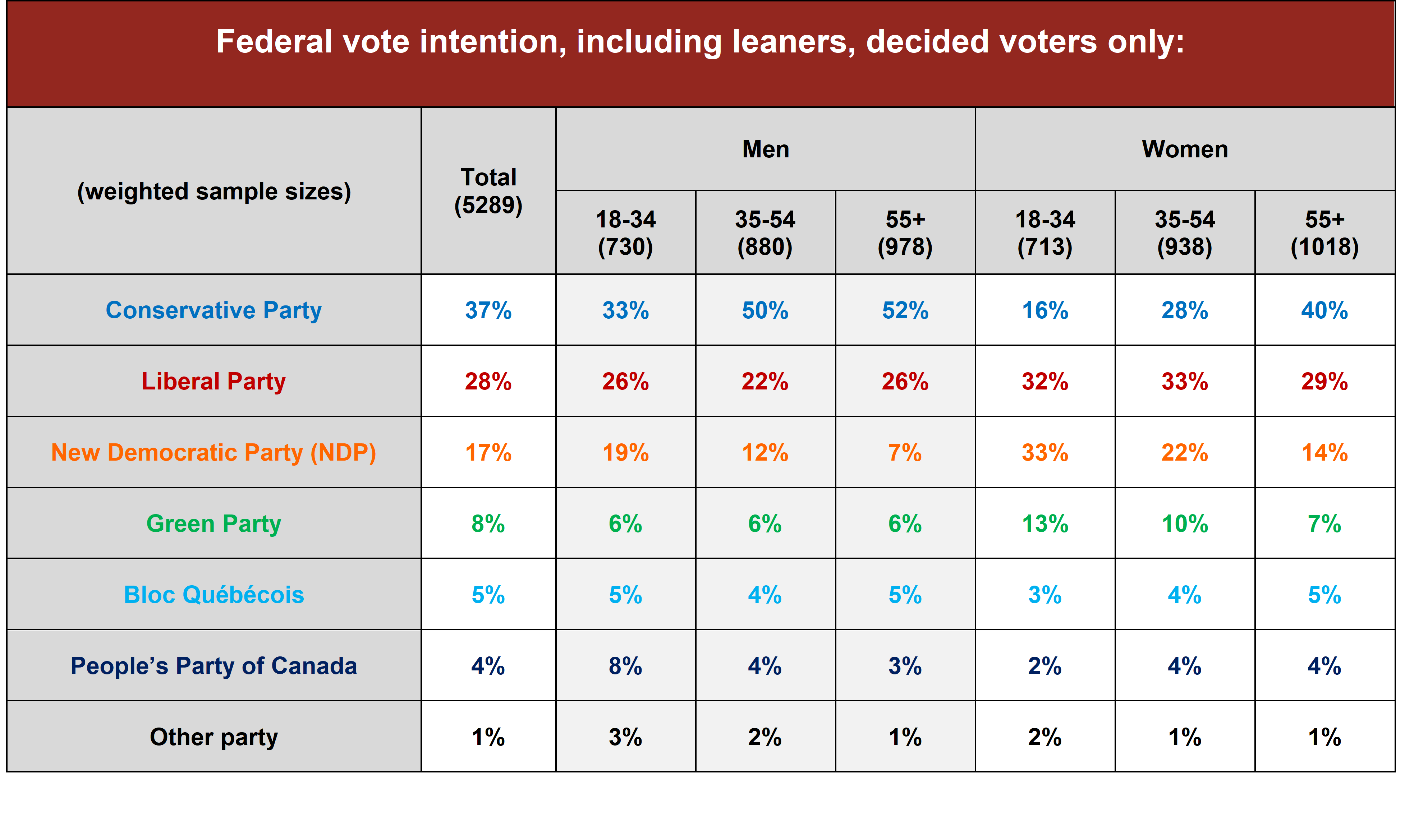 - Demographics are a huge driver of partisanship, with men and older Canadians skewing much more Conservative, while women and younger Canadians are more likely to be sticking with the Liberals or choosing other left-of-centre parties