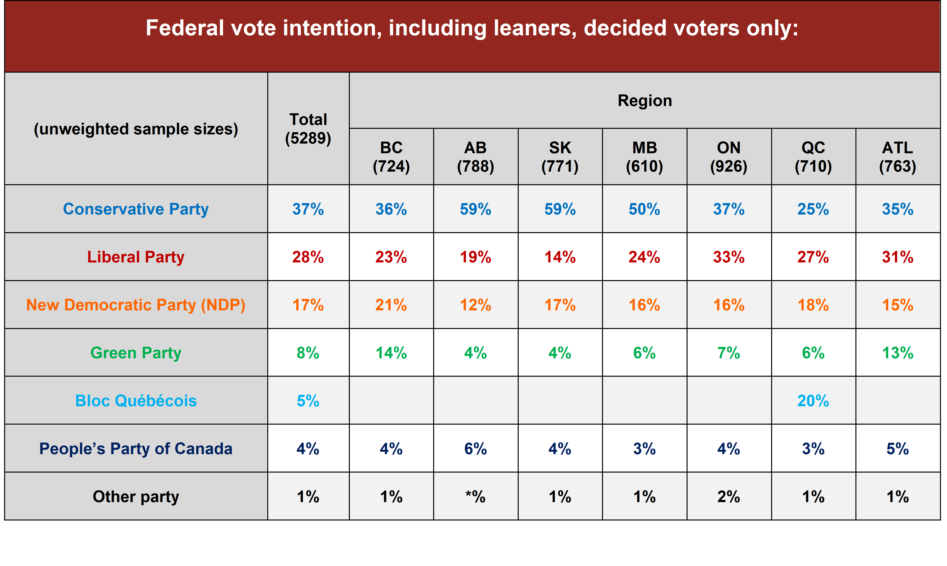 - Regionally, the Liberals trail the Conservatives in every region but Quebec, where vote intentions show a competitive four-way race