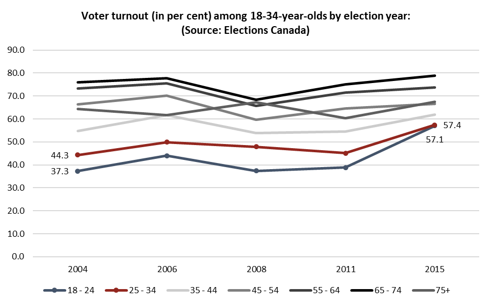 These age and gender differences are significant not only because they tell such different stories about the moods of different segments of the Canadian electorate, but also because of the dramatic differences in turnout between age groups.