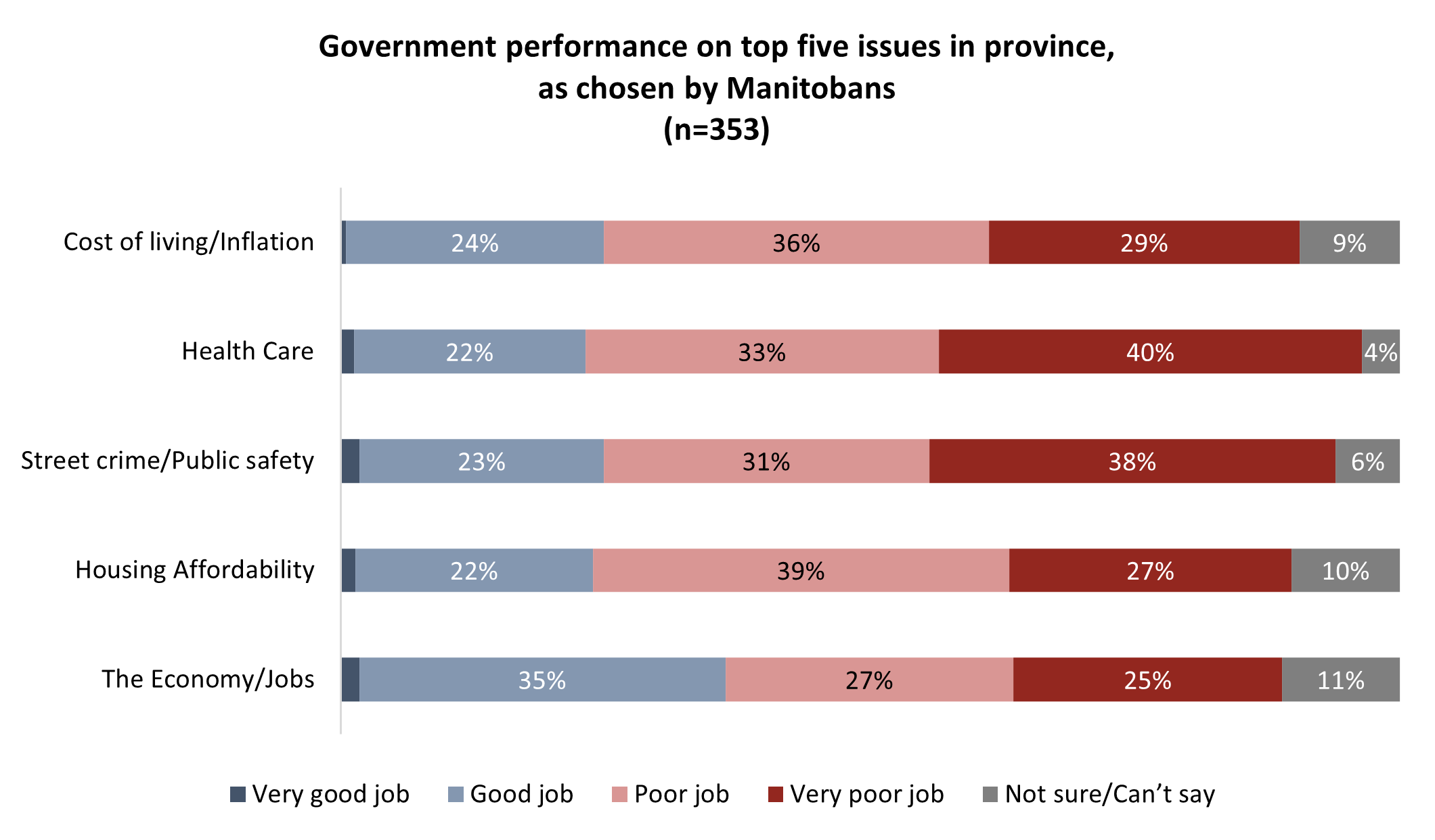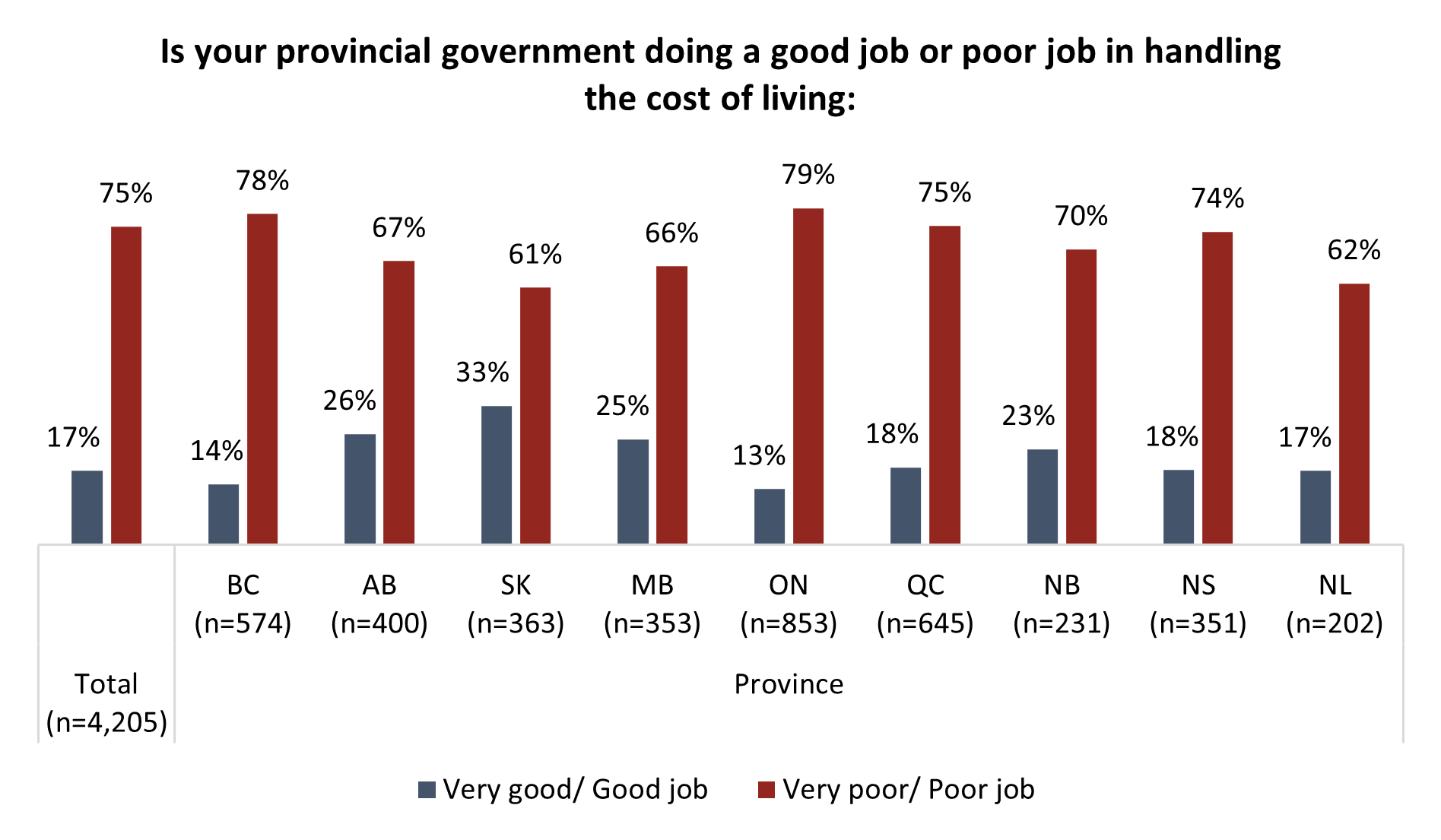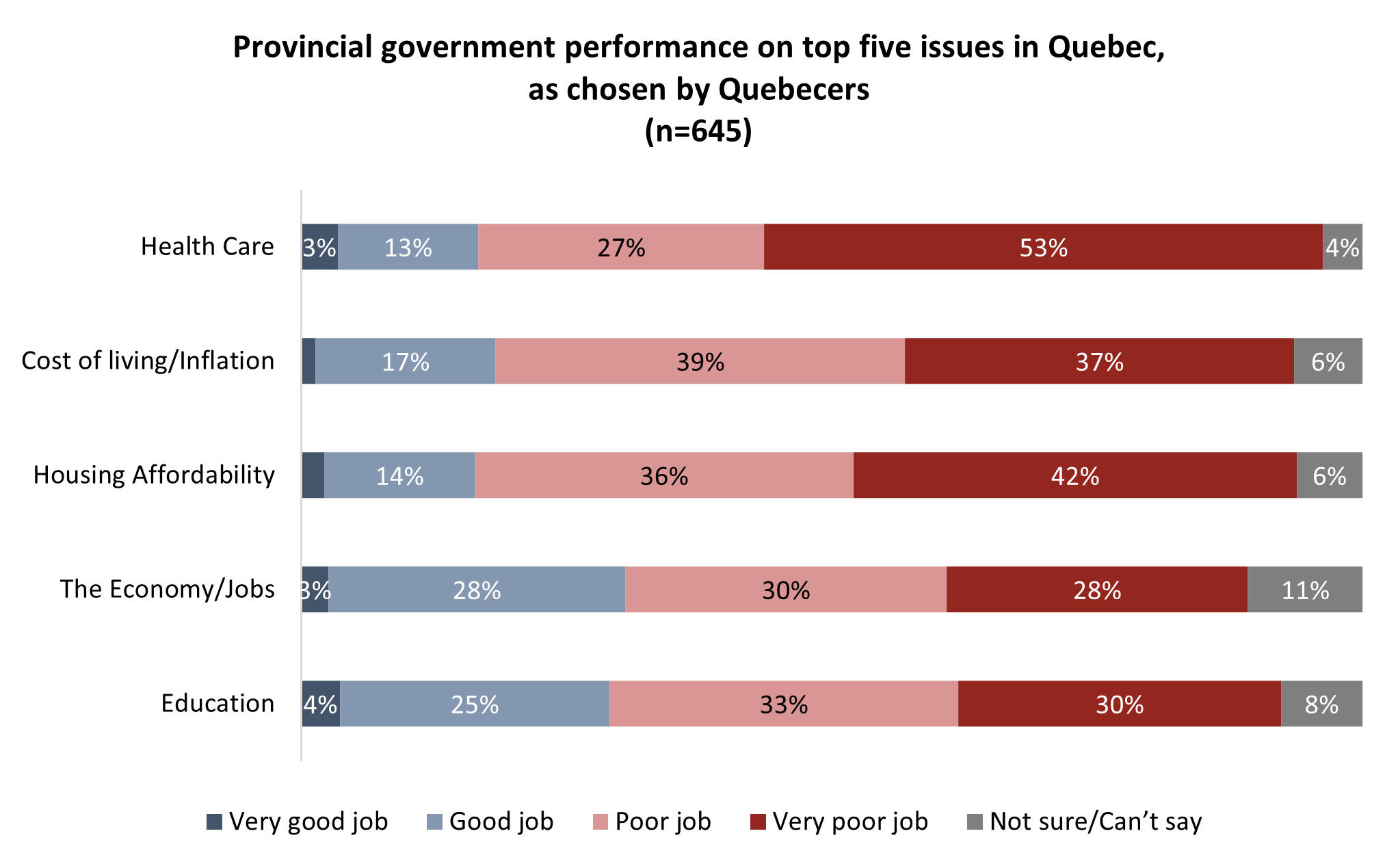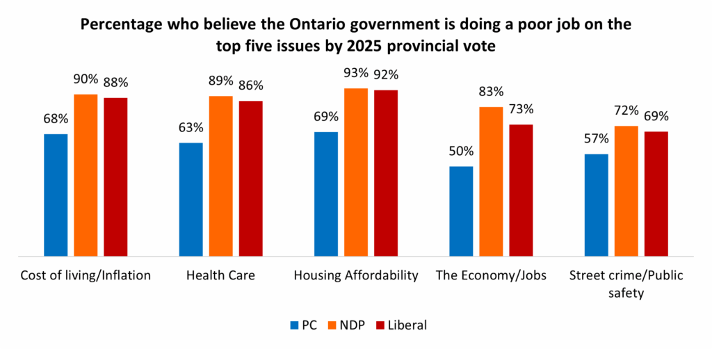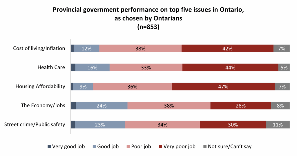On the high cost of living (79%), health care (77%) and housing affordability (83%), more than three-quarters of Ontarians say the government is doing a poor job: