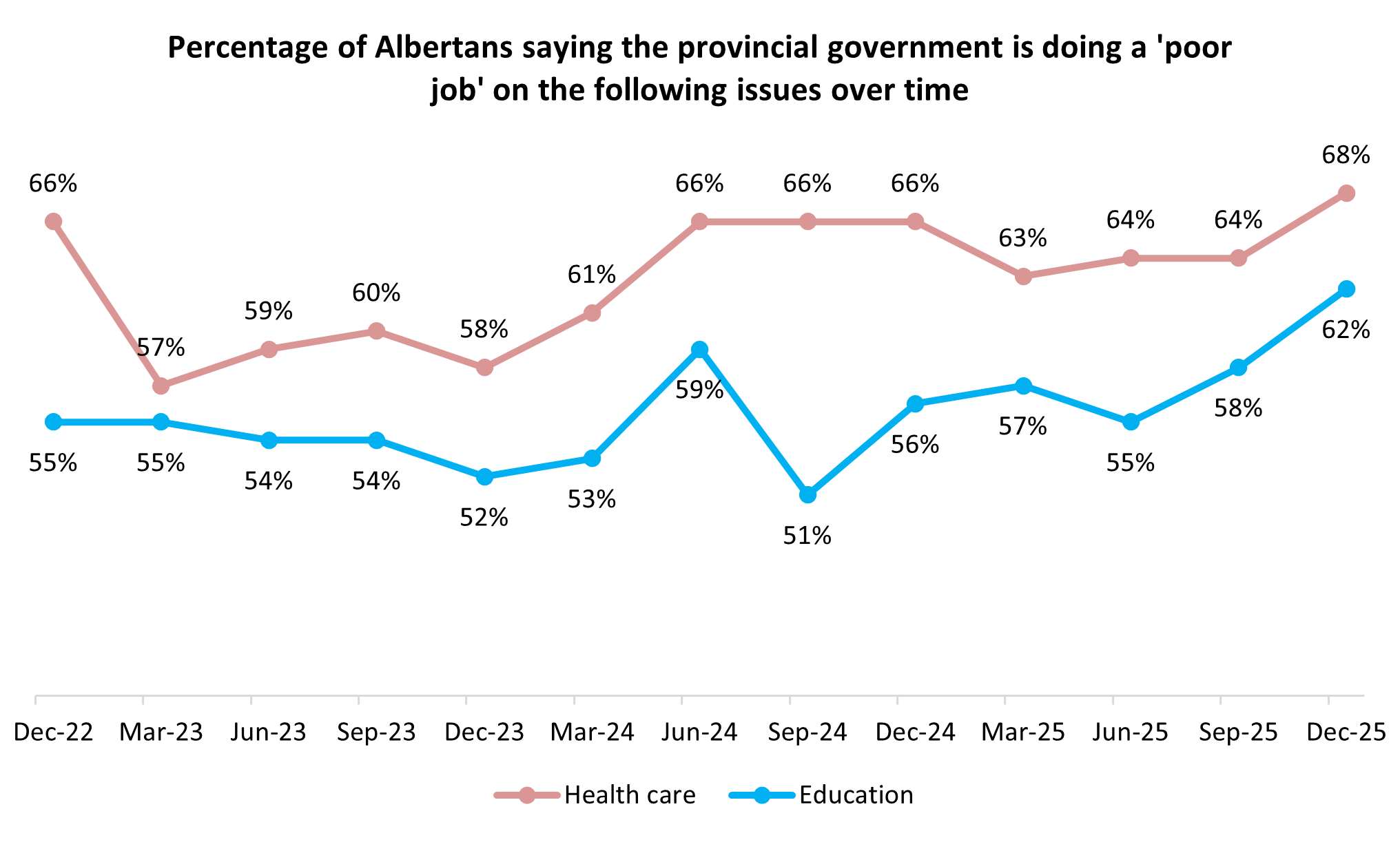 Returning to those headline-making issues in Alberta in 2025, criticism of the province’s performance on education is rising. Those who believe the UCP are doing a bad job on health care is also at its highest point since Smith became premier at the end of 2022: