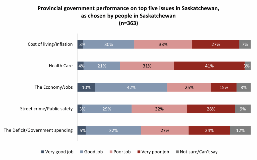On its worst issue, health care, criticism is relatively bipartisan. Nearly all past NDP voters say the government has done a poor job, joined by half of those who supported the Sask. Party. Residents are facing major health care challenges in rural areas, and staffing shortages and burnout are reportedly a significant concern.
