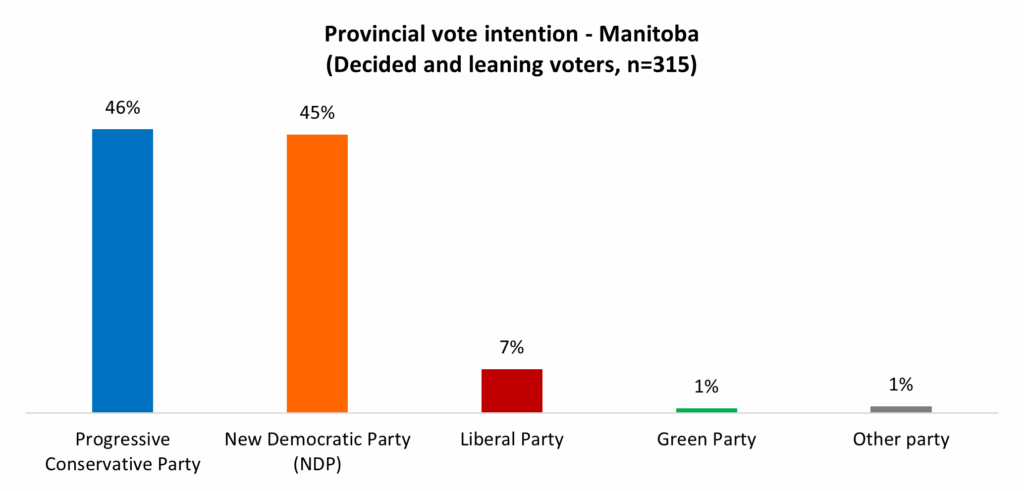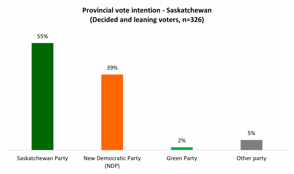 The province held an election last fall, so another isn’t scheduled for another three years. Currently, a majority (55%) say that they would vote for the Saskatchewan Party, while 39 per cent would vote for the opposition: