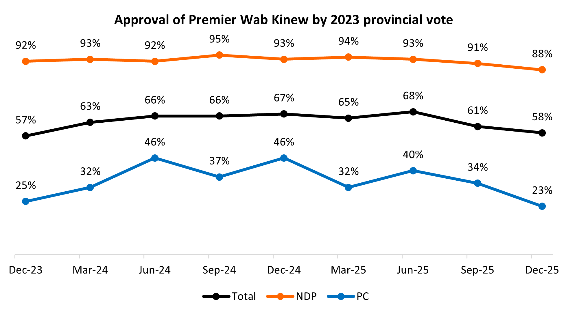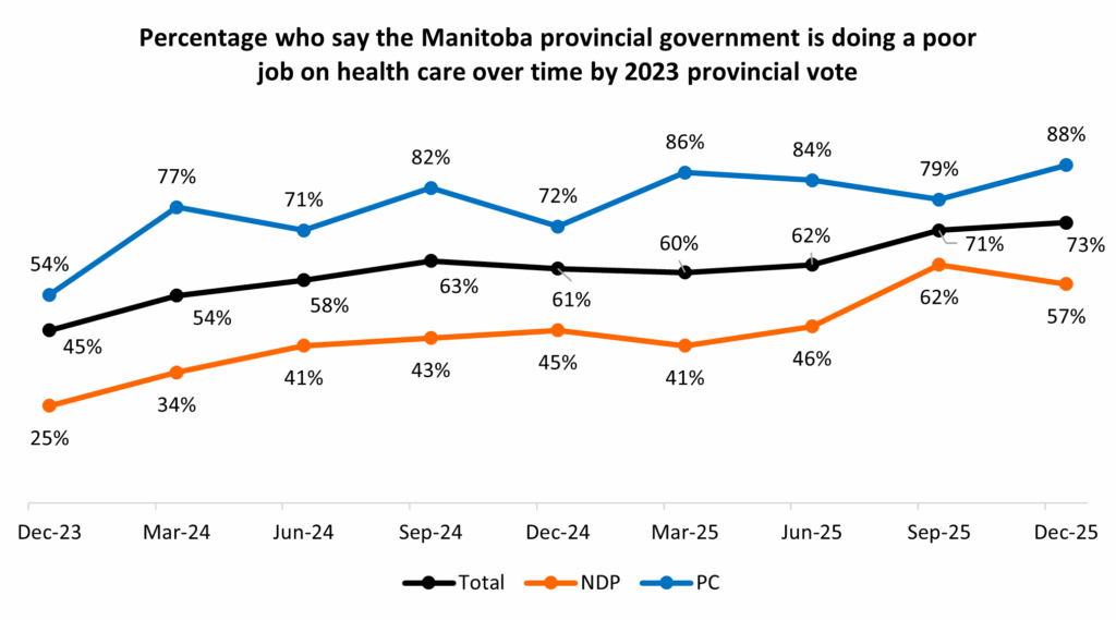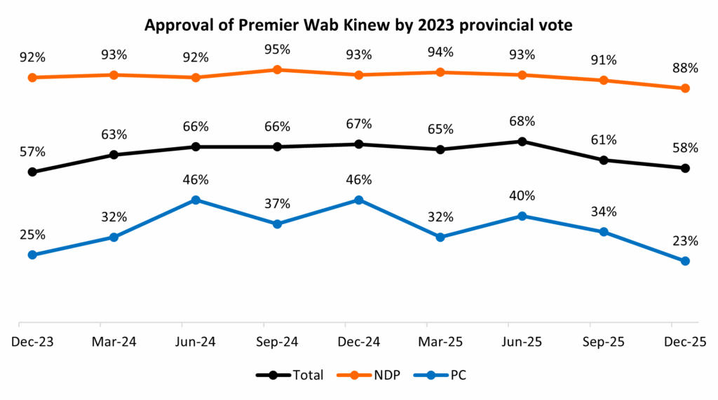 Kinew previously was receiving more approval from opposition parties than his peers. Currently, one-quarter of those who voted PC in 2023 say they approve of Kinew. Compare that to the opposition party approval for B.C. Premier David Eby (8%), Alberta Premier Danielle Smith (13%), and Saskatchewan Premier Scott Moe (13%). Kinew’s approval has been rising and falling within the PC voter base, while it has remained consistent among NDP voters: