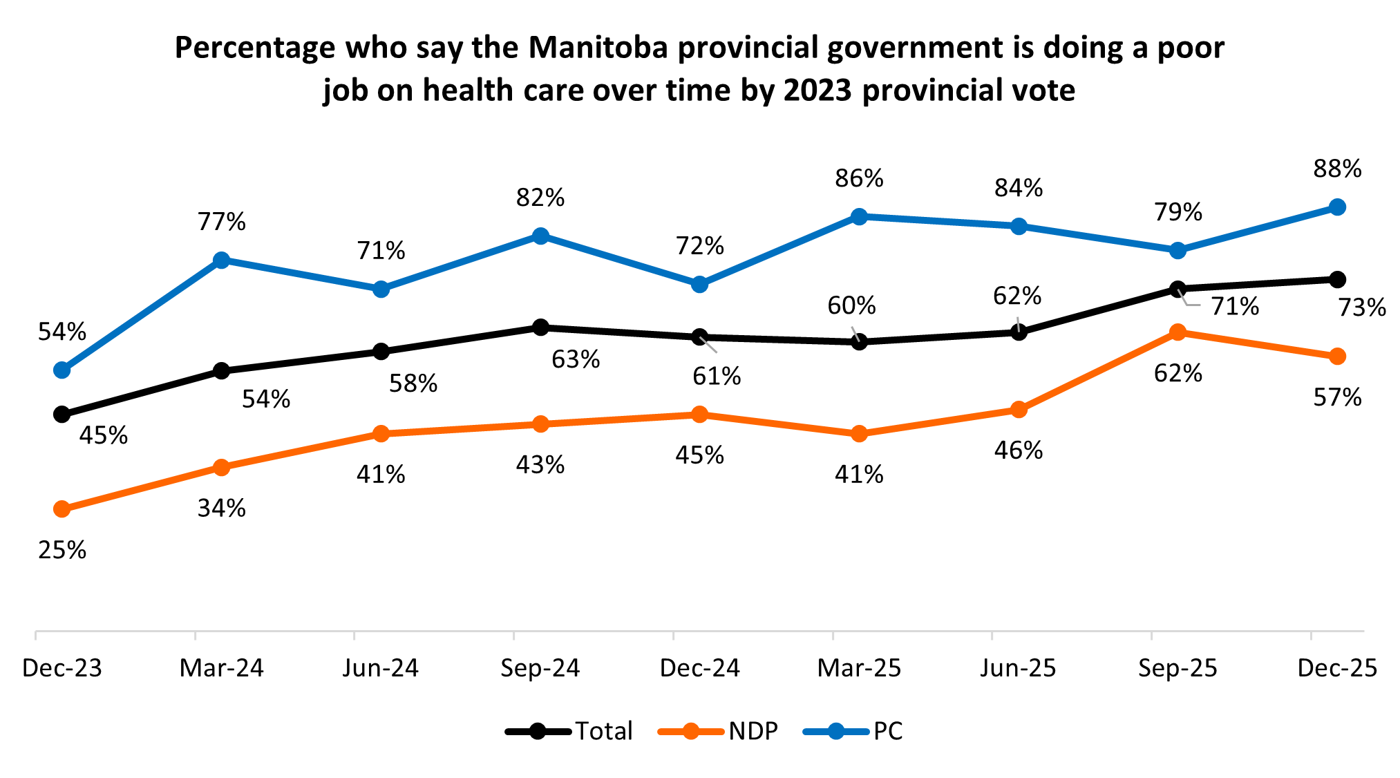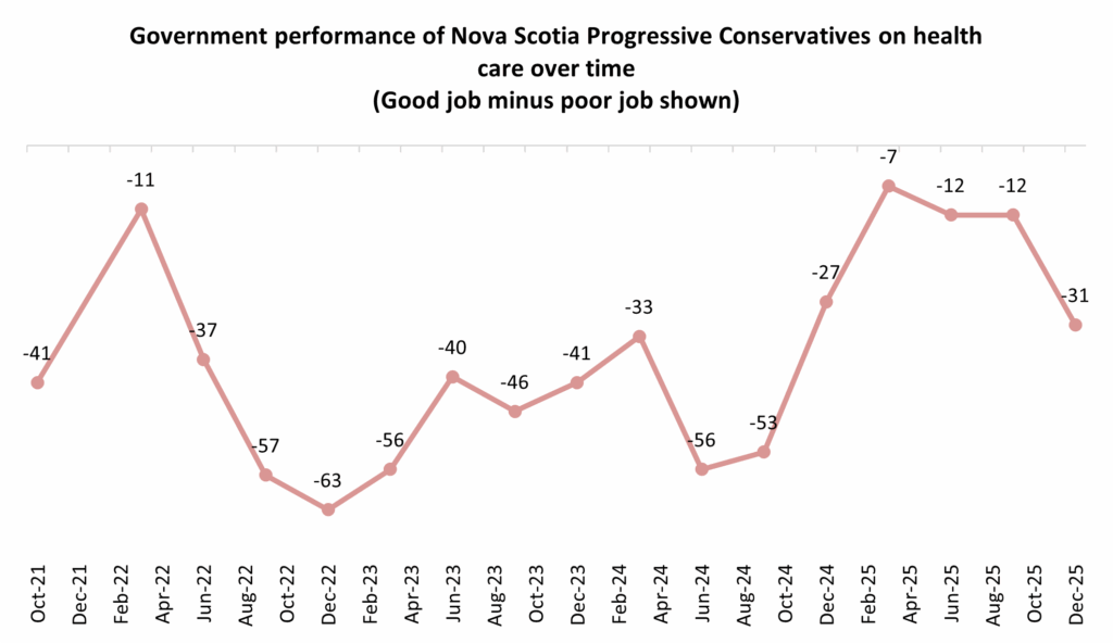Perhaps seeing some positive developments from the government’s investment, Nova Scotians have been much less likely to be critical of the government’s performance on health care in 2025 than in past years. Although the government finishes the year with a majority (63%) in the province saying it is performing poorly on the issue, on average, the Houston Progressive Conservatives have received better grades this year than in the early years of its government: