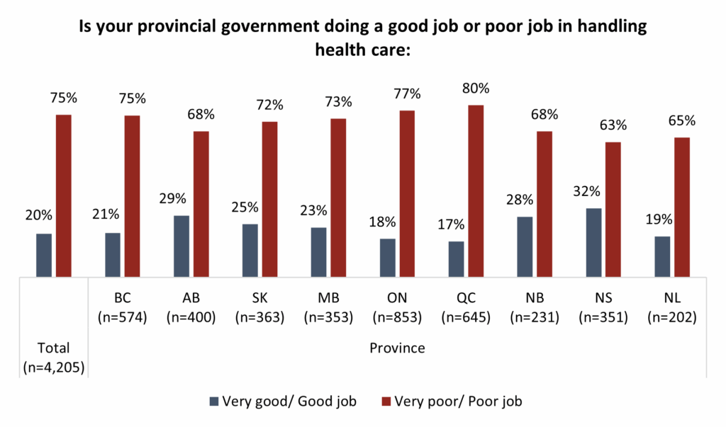 Scores range from 35 in Saskatchewan, where residents are mostly likely to rate their government as performing well on the issues they care most about, to 20 in Ontario. Although the two prairie provinces of Alberta and Saskatchewan are seen by residents in each as performing better than those in other provinces rate their own respective government, there are also red flags. On health care, 68 per cent in Alberta and 72 per cent in Saskatchewan believe their provincial government is doing a ‘poor job’. On the rising cost of living, 67 per cent in Alberta and 61 per cent in Saskatchewan are critical of their governments’ performances.