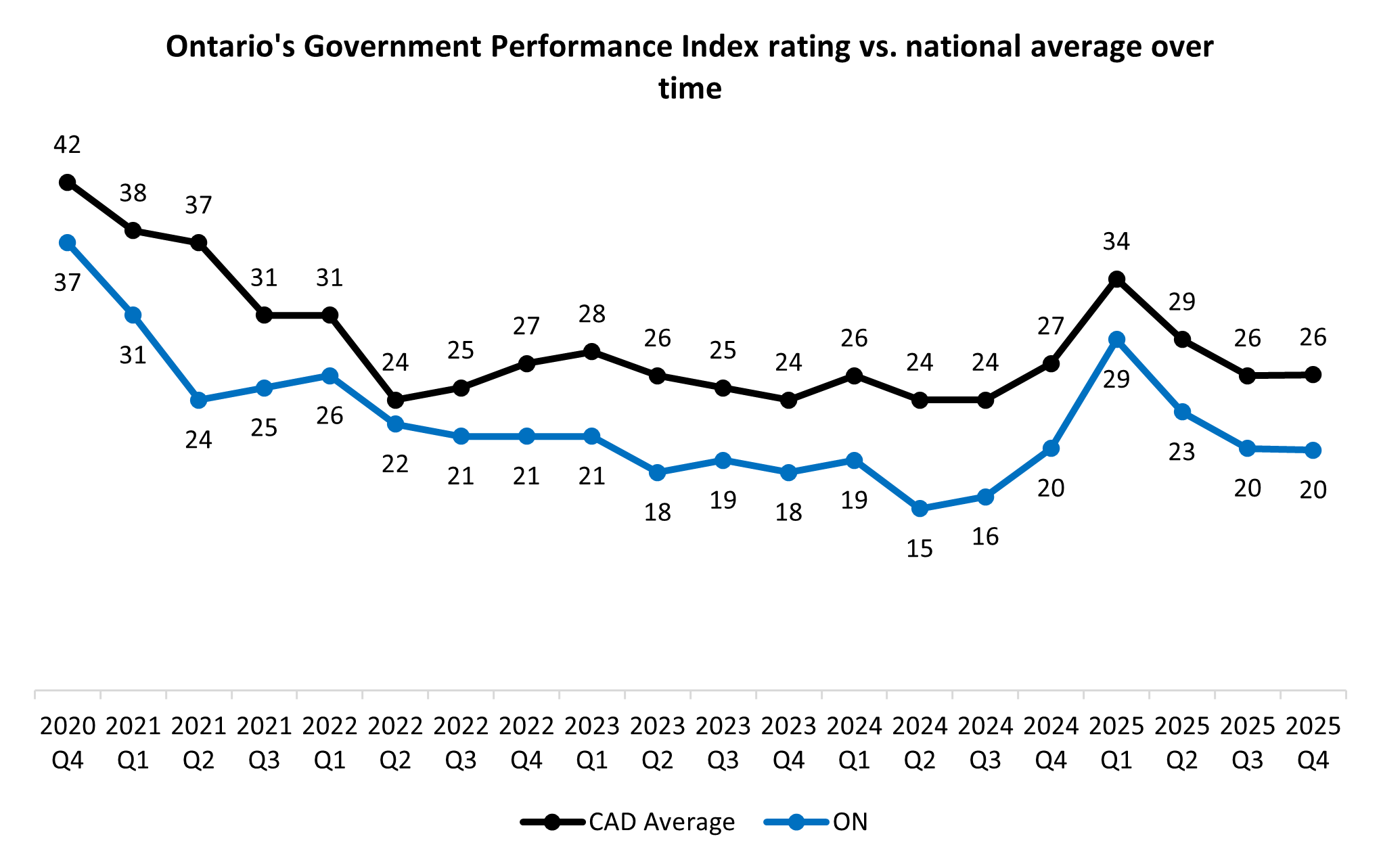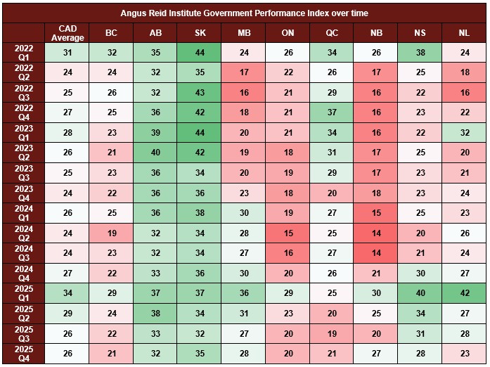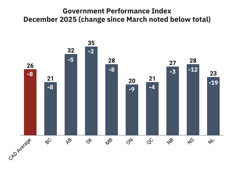 New data from the non-profit Angus Redi Institute finds that satisfaction with governments has dropped considerably compared to the beginning of 2025. Comparing scores on ARI’s Government Performance Index – an average of satisfaction across 16 issues – scores are down by approximately one-quarter. The average in March – led by a significant rise in those saying the tariffs were a top issue – was 34 nationally. That has dropped to 26 now, as the cost of living and health care are back atop the list of priorities, and largely a cause of dissatisfaction.