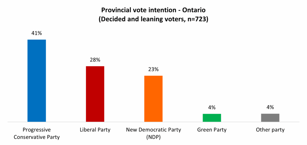 And yet, if an election were held today, Ford would likely return with another majority mandate. Two-in-five (41%) in the province say they would vote for the Progressive Conservatives. The Liberals (28%) and NDP (23%) trail: