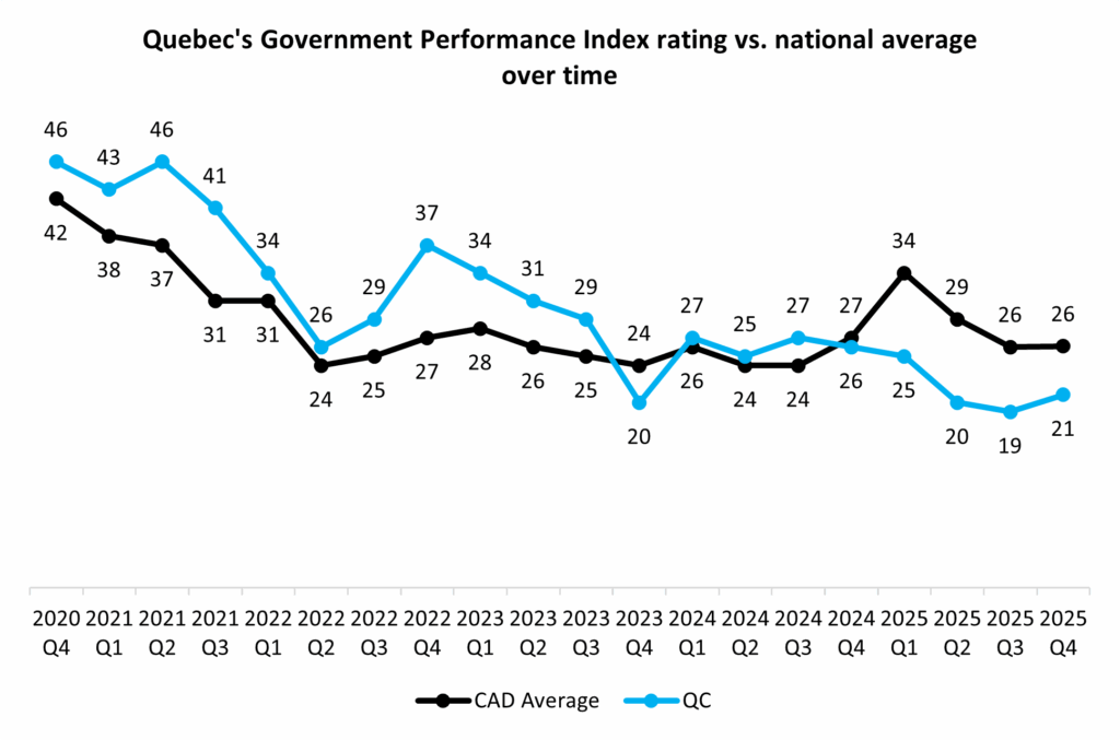 There will be other snow days down the line, but on his most recent wintery reflection Premier François Legault has decided to stay and contest the 2026 election, which is shaping up to be a reckoning for the premier and the long-standing Coalition Avenir Québec majority. Legault’s personal popularity has cratered in his second term as Quebecers have found plenty of fault in his government’s performance on key issues. Most in the province believe the CAQ are performing poorly on health care (80%), the high cost of living (76%), housing affordability (78%), the economy (58%) and education (63%), the top five issues in the province:
