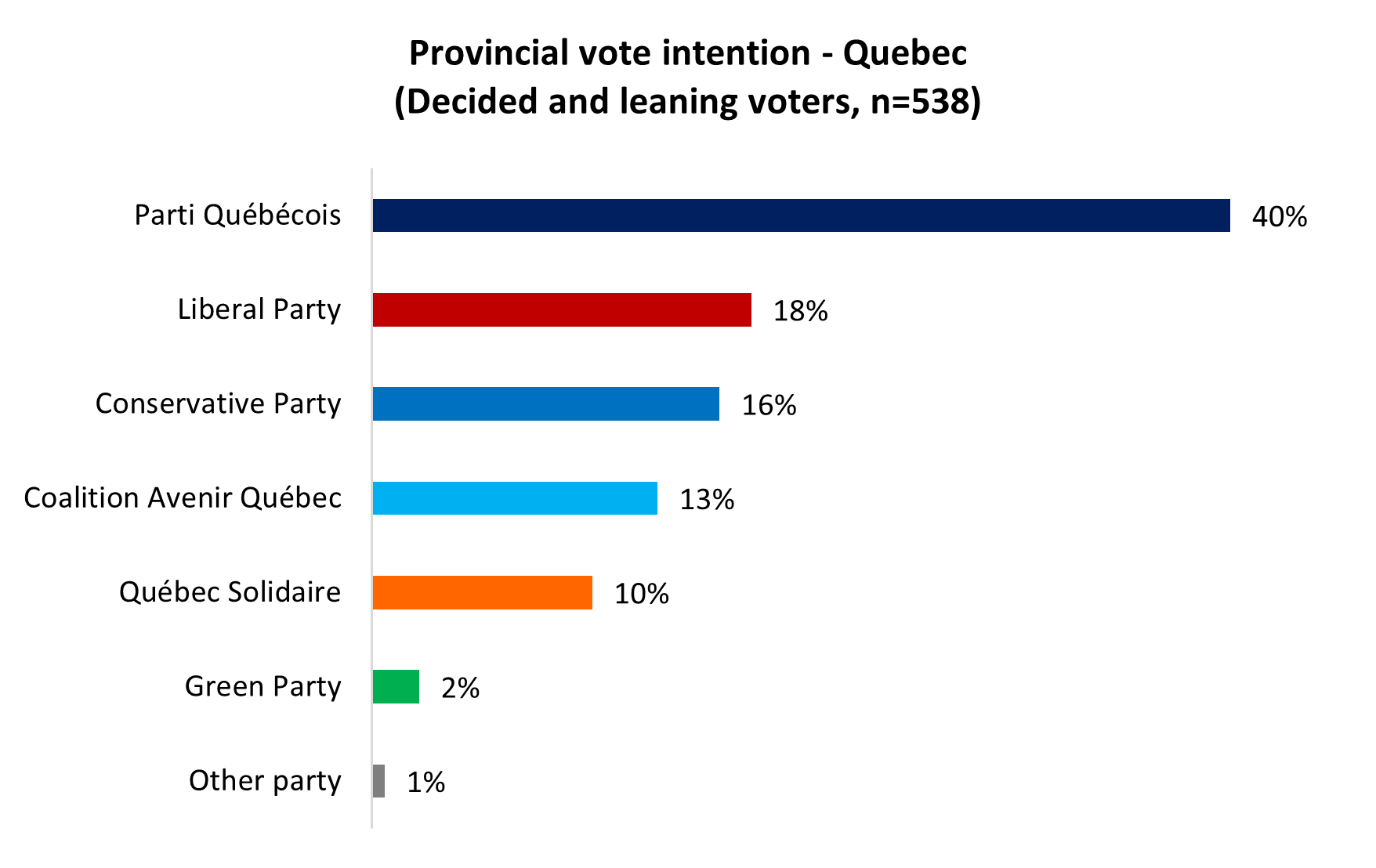 As things stand, Legault won’t get a third term in office to turn things around. Two-in-five (40%) in the province say they would vote for Parti Québécois if an election were held today, putting that party well ahead of the Liberals (18%), whose leader, former federal minister Pablo Rodriguez, resigned after these data were collected. The Conservatives (16%) are close behind the Liberals. Legault’s CAQ is the choice of just over one-in-eight (13%):