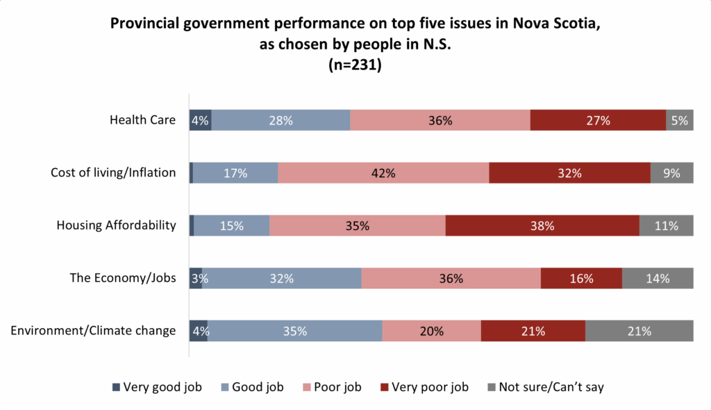 One year ago, Premier Tim Houston and the Progressive Conservatives secured a second straight majority with a snap election. Although by the Angus Reid Institute’s Government Performance Index, the Nova Scotia government has performed better than its peers, there are still plenty of concerns from residents in the province. Three-in-five (63%) believe Houston’s government has performed poorly on health care, the top issue in the province. Cost of living, the second highest chosen issue, is also seen as an area that needs improvement by most in Nova Scotia (74%):