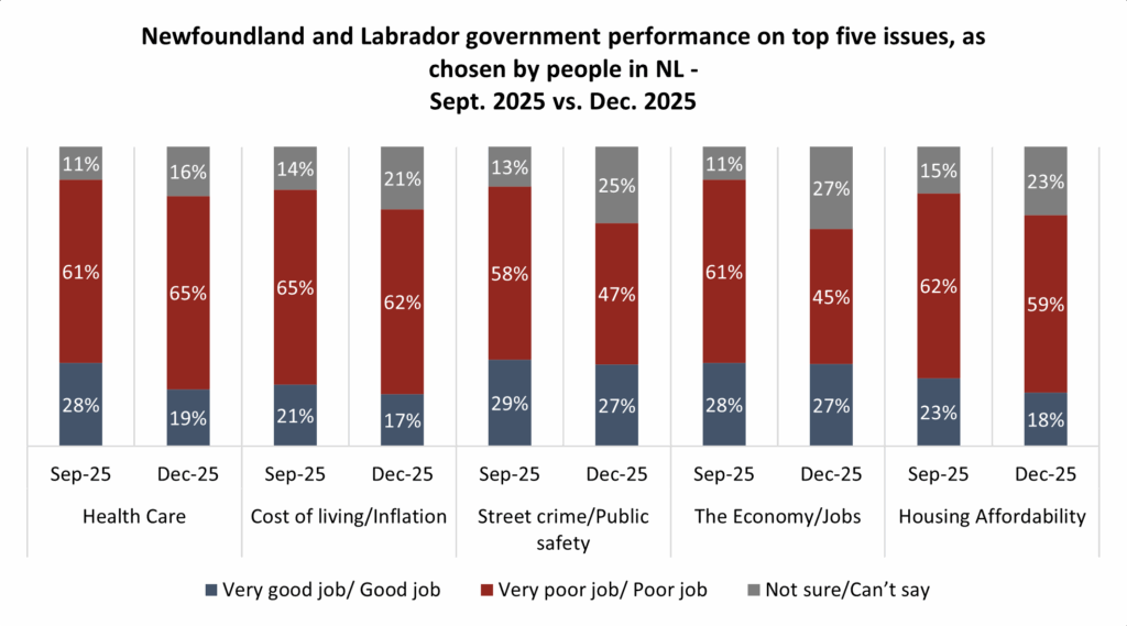 There’s a different party in power in St. John’s but residents in Canada’s eastern-most province are not giving Premier Tony Wakeham and the Progressive Conservatives much grace on the key issues of the day. As was the case for the previous Liberal government, there are more in the province who believe the government is handling health care, cost of living, public safety, the economy and housing affordability poorly than well. There has been an increase in the proportion of Newfoundlanders and Labradorians reserving judgement on these top issues, but perhaps not as much as one would assume given the change in government: