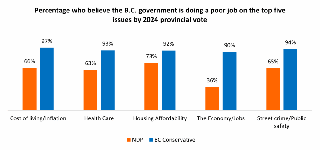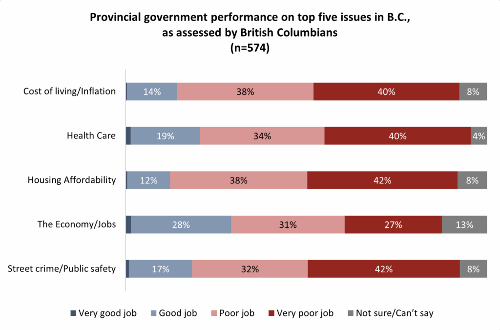 The top five issues as chosen by British Columbians are the cost of living, health care, housing affordability, the economy and public safety. The governing BC NDP do not perform particularly well on any of these, which has led to their place at the bottom of the Government Performance Index.