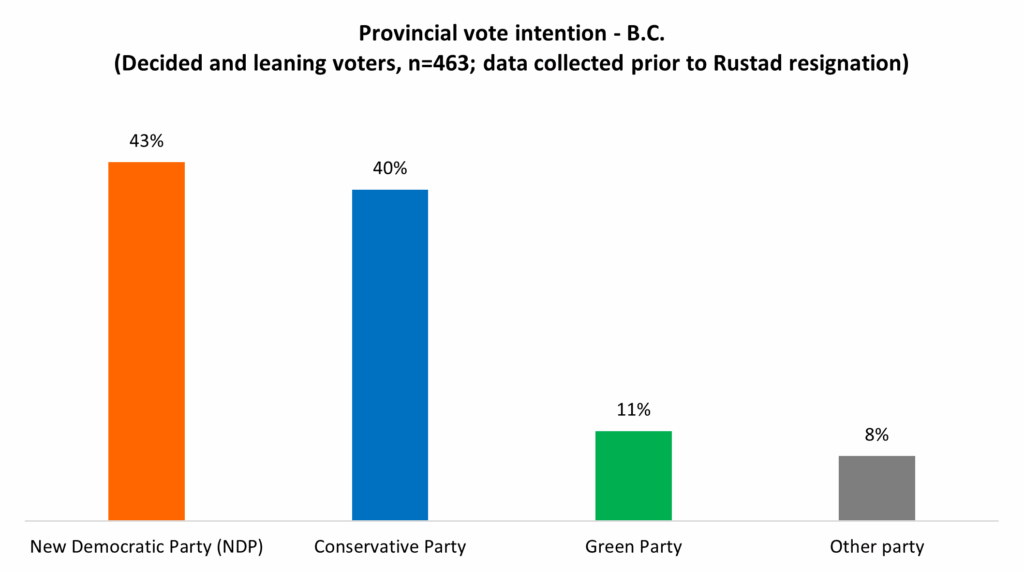 While the BC Conservative Party must now undergo the process of finding a new party leader after John Rustad resigned early in December, the party is not in a terrible position electorally speaking. If an election were held currently, 40 per cent say they would support the BC Conservatives. The BC NDP hold a three-point lead over their main opposition, but the Green Party, under new leader Emily Lowan, has also re-entered double digits, up from eight per cent in previous polling from ARI. Eight per cent would support another party, though it is worth noting that these data were collected prior fledgling party OneBC reportedly removed its leader Dallas Brodie, though Brodie insists she is still the head of the party: