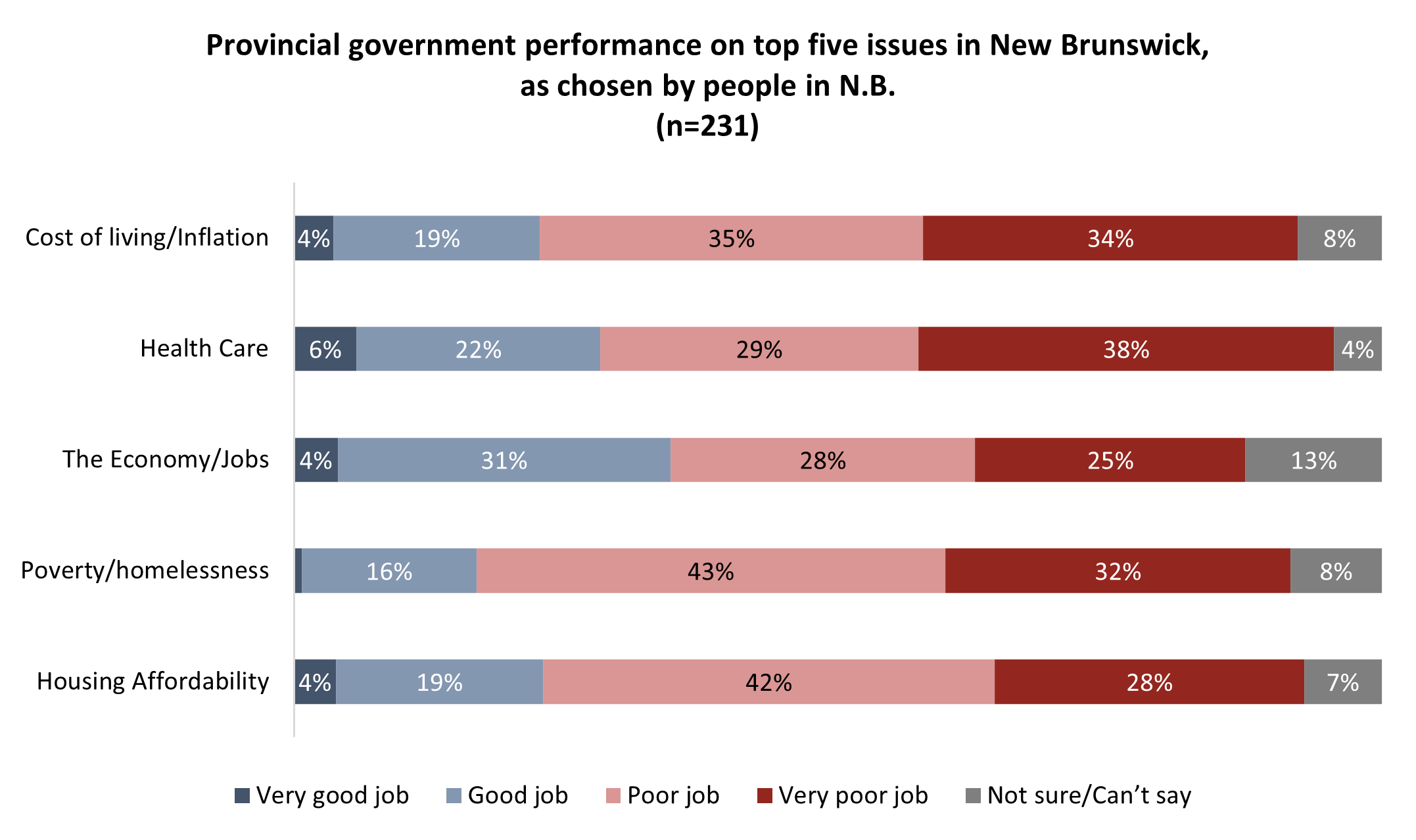 The Liberals under Premier Susan Holt have had more than a year now to tackle the key issues facing New Brunswick, including the far-and-away top two, cost of living and health care. Residents are more critical than not of Holt’s performance. Most believe the provincial government is performing poorly on the high cost of living (69%) and health care (67%):