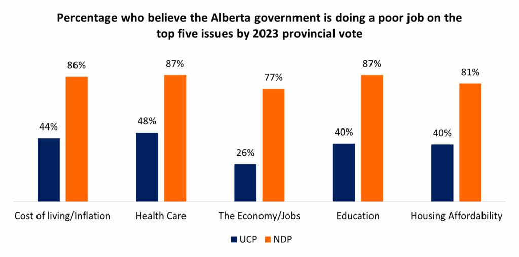 UCP voters are more enthusiastic about the government’s performance on the economy (66% good, 26% poor) an issue closer to more of their hearts (41% top issue) than those who voted NDP in 2023 (20% top issue, see detailed tables for full data).