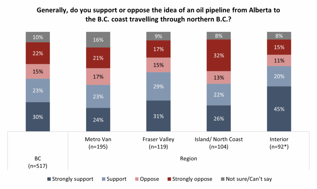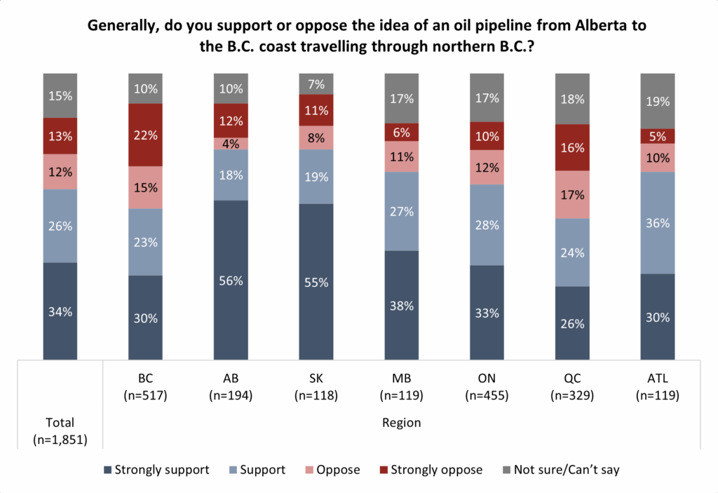 The concept of a new Alberta to northern B.C. pipeline remains popular among Canadians with a majority (60%) saying they support the project and one-quarter (25%) opposed.