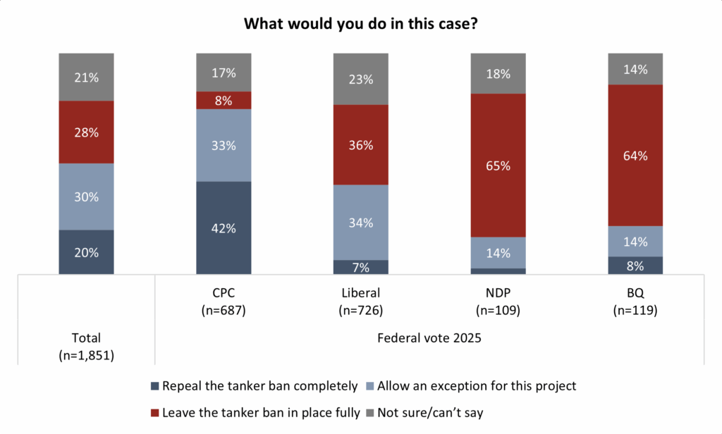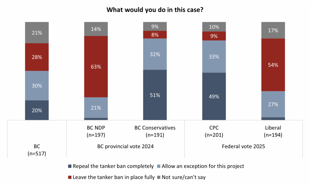 Comparing federal party supporters in B.C., a majority (53%) who voted Liberal in the spring election say they want the tanker ban to stay in place. Half (49%) of CPC voters say they want it repealed.