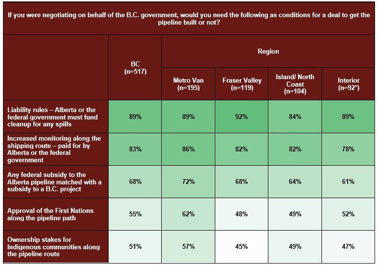The MOU signed by Alberta and Ottawa details that the pipeline will have “Indigenous Peoples’ ownership and benefits”. Half in B.C. (51%) say that would’ve been a condition for them to get the pipeline built. Approval of the First Nations along the path (55%) is selected by more, while environmental and financial concerns around the liability for spills are a higher priority to British Columbians. Nine-in-ten (89%) in the province believe Alberta or the federal government must fund cleanup for pipeline spills and four-in-five (83%) believe Edmonton or Ottawa should fund increased monitoring along the coast if the pipeline is built.