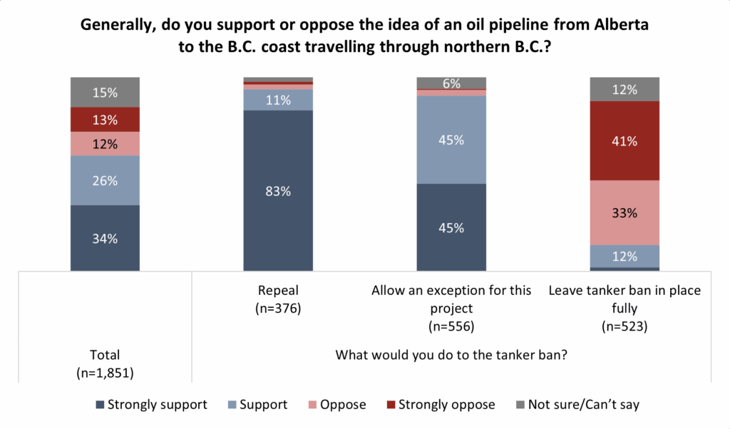 Views of the tanker ban appear to heavily influence support of the pipeline. Most (74%) who want the tanker ban to stay in place say they oppose the pipeline, while nearly all who would repeal the ban or allow an exception for this pipeline project are in support of the pipeline: