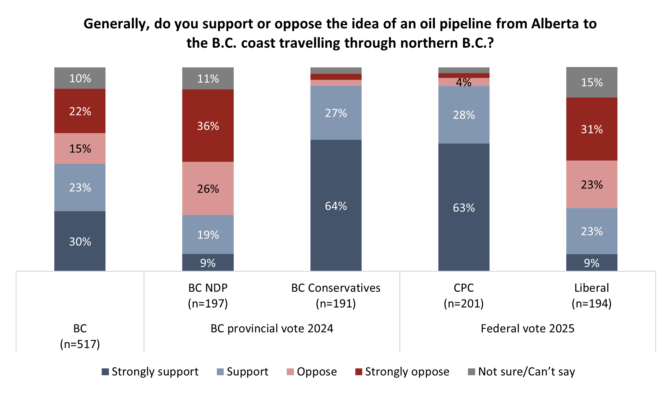 The problem for Mark Carney among his own voters in B.C. is more acute. Those who voted for the Conservative Party of Canada in the federal election earlier this year are nearly all (91%) in favour of the concept of the pipeline. However, most recent Liberal voters in B.C. (54%) – a group that included many traditional federal NDP and Green voters – are opposed.