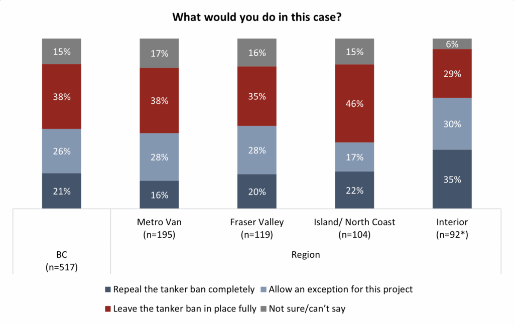 The other core component of this discussion is the tanker ban that would need to be partially repealed in order to allow sufficient traffic to make a pipeline financially functional. It speaks to the caution that the path to achieving a pipeline to a northern B.C. terminal may be long and winding. An exception or full repeal is only supported at a majority level in the Interior. On Vancouver Island and along the north coast, nearly half say not to touch it:
