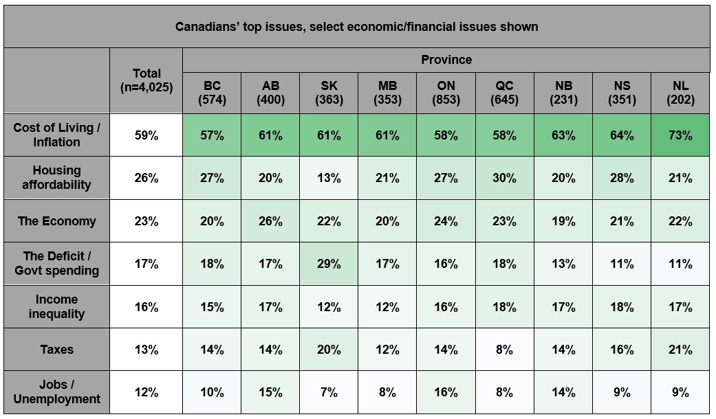 Across the country, concern over the high cost of living is shared, while there is less agreement on how pressing housing affordability is depending on the province: