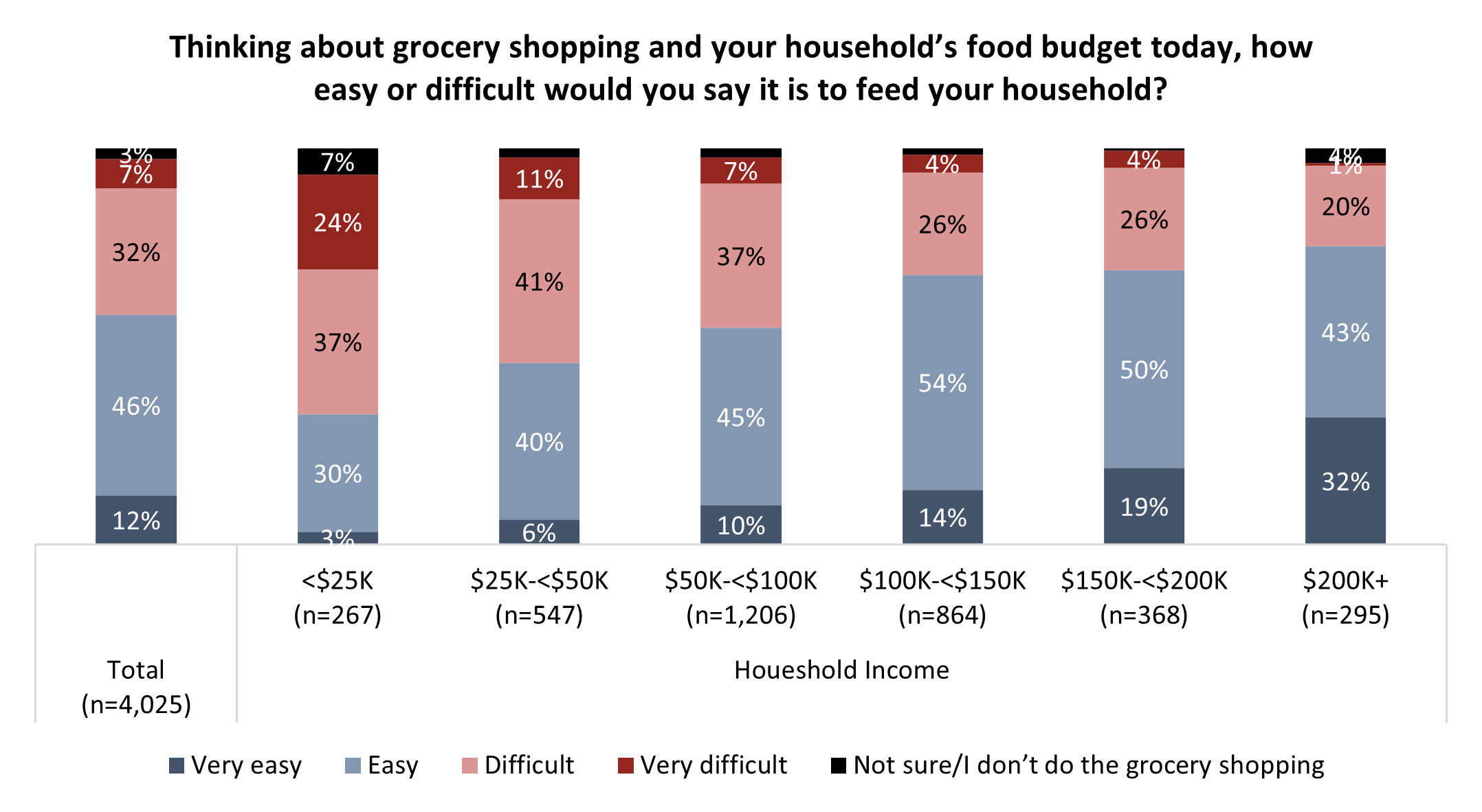 - Two-in-five Canadians (39%) say it is difficult to keep up with their household grocery bills. This rises to a majority among those whose household income is below $50,000 annually.