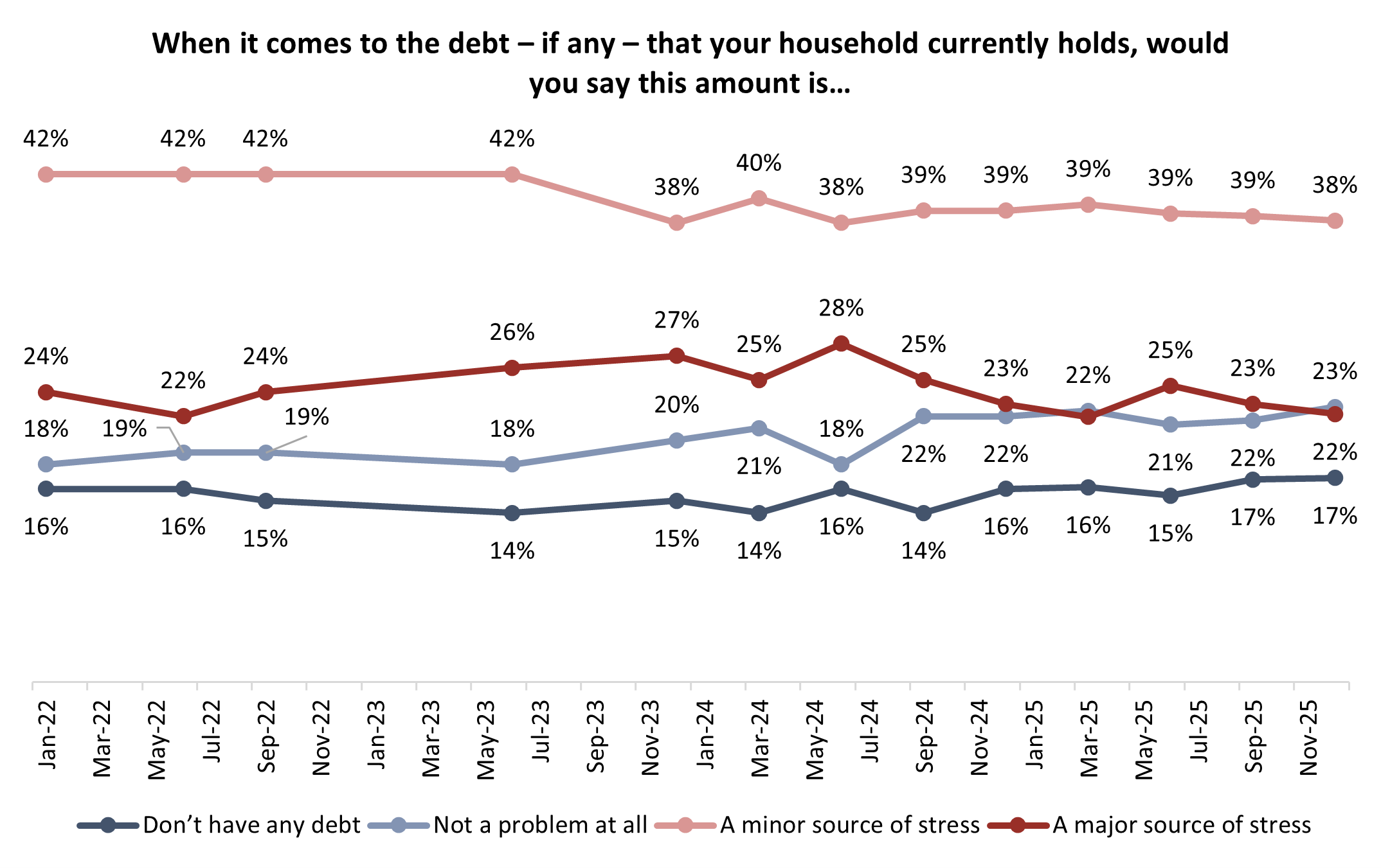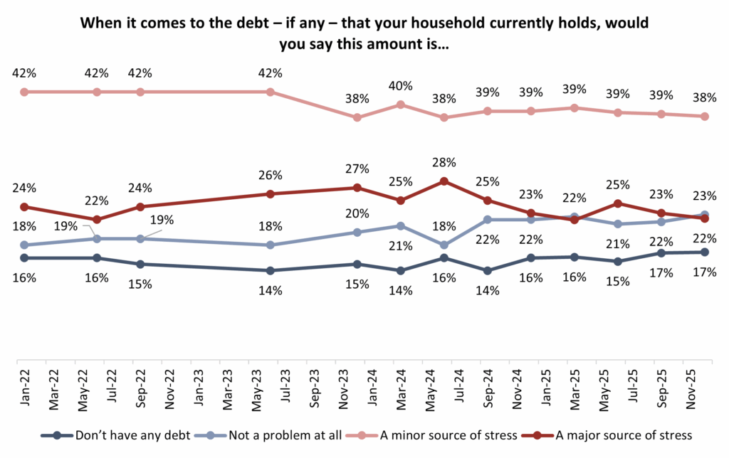 The percentage of Canadians who say they are stressed about their debt levels has been relatively stable since 2022. Three-in-five (60%) describe their debt as either a minor (38%) or major (22%) source of stress. For one-quarter (23%), they have debt but it’s not a problem, while one-in-five (17%) say they don’t have any debt: