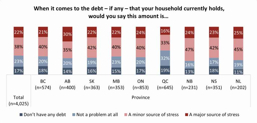 Debt levels vary by province. Alberta and Newfoundland and Labrador are consistently the two provinces at the highest levels when it comes to consumer debt per household. Three-in-ten (30%) in Alberta describe their debt as a major source of stress, the most in the country, followed by those in Canada’s easternmost province (25%). One-quarter (24%) in Ontario also report high levels of stress from their debt: