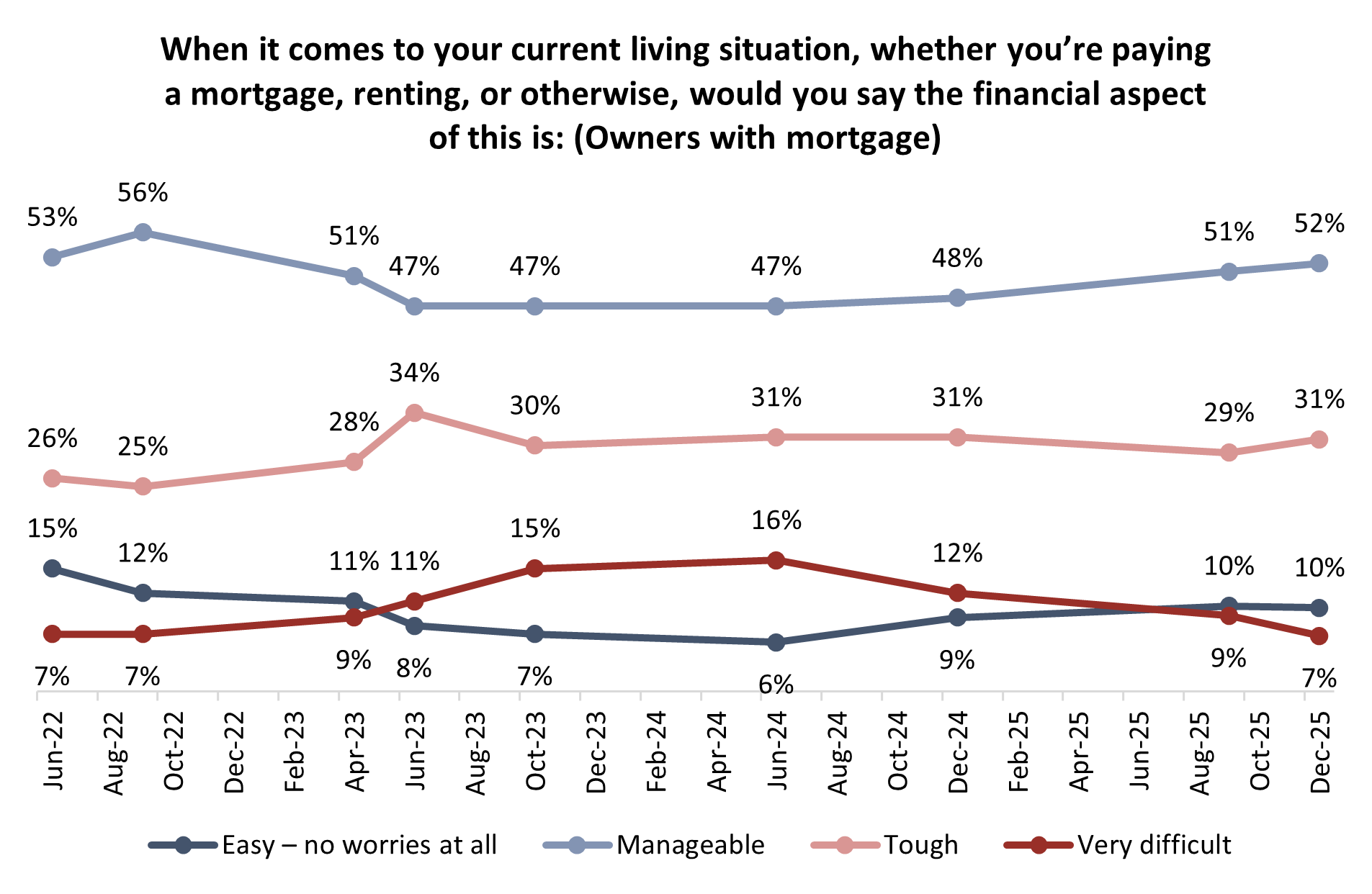 For now, three-in-five (62%) of homeowners with mortgage describe the cost as easy (10%) or manageable (52%); two-in-five (38%) report more challenges.