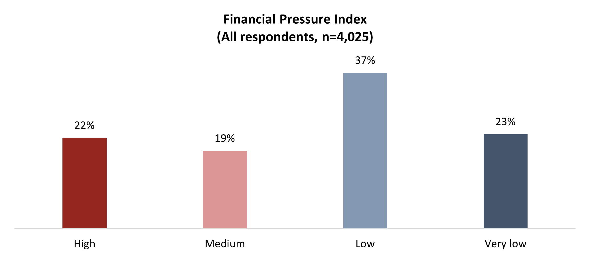 Economic realities vary widely in Canada depending on a number of variables, from job security to housing affordability, to one’s own outlook on their financial health. To gauge these views, ARI created a Financial Pressure Index, which scores respondents on eight questions and sorts them into one of four groups based on the intensity of the financial pressure they face. Below are the overall group sizes: